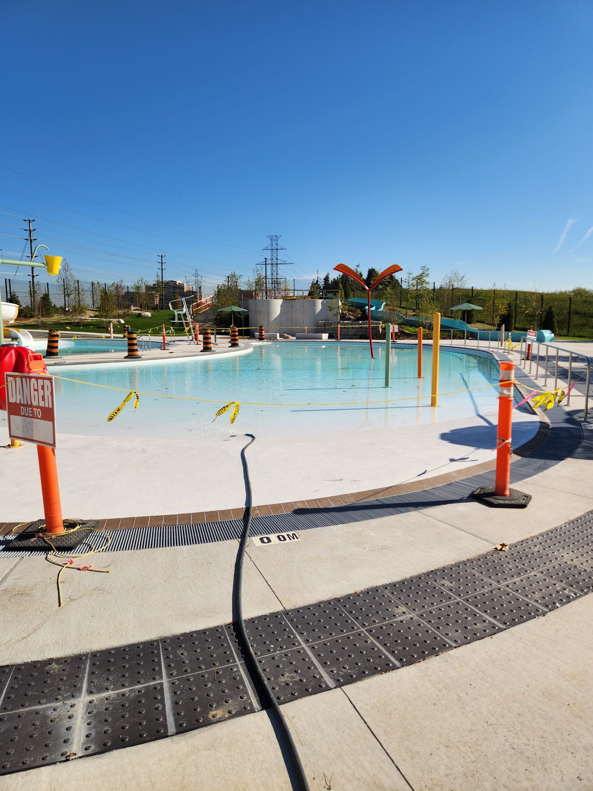 The hill water slide and the accessible ramp leading to the waterfall have been installed. Paving of the pool decks is ongoing.