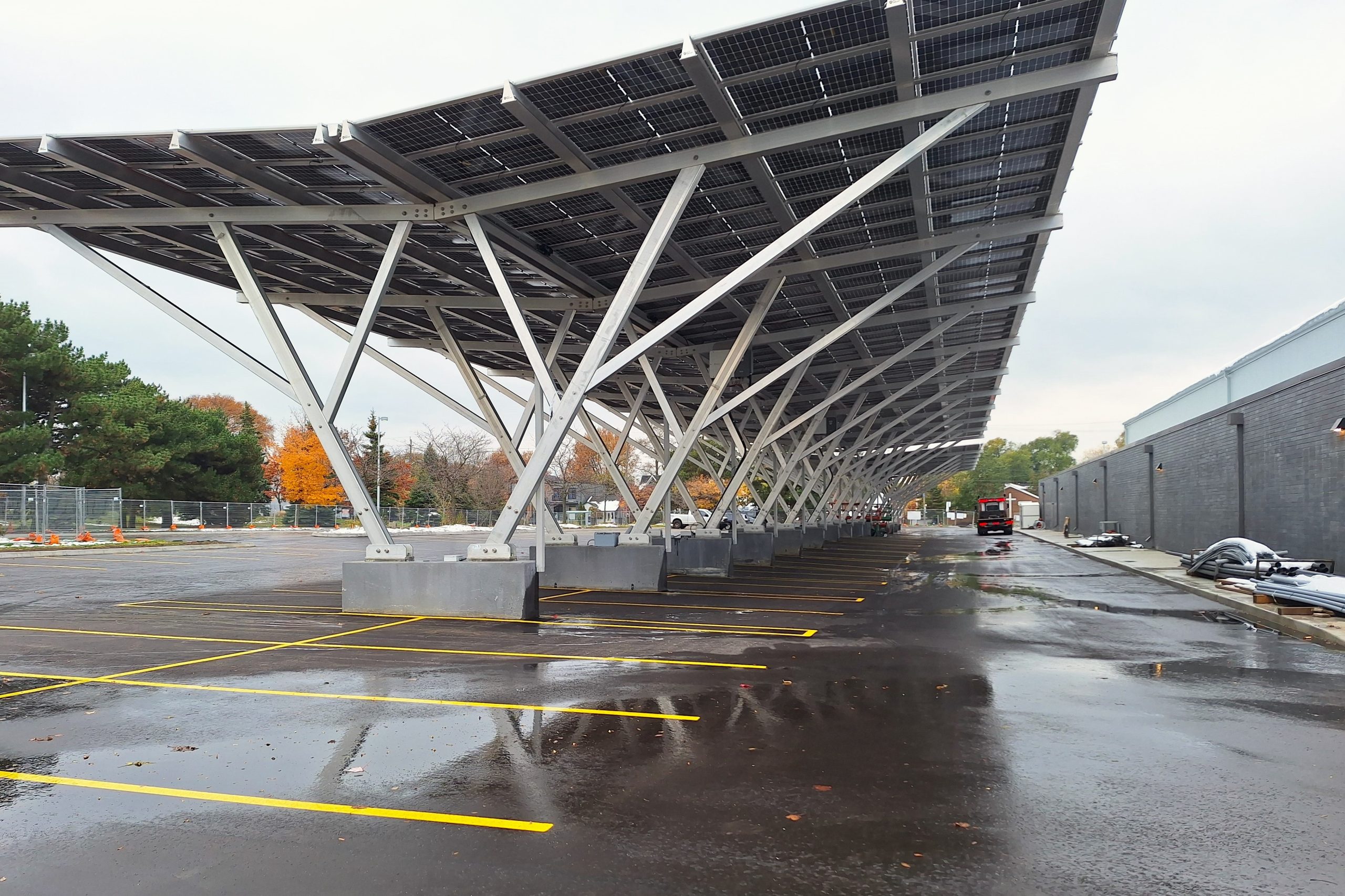 The solar carport structure in the parking lot is in place, with solar panels to be installed next. Piping for the rink’s refrigeration system is nearing completion, and preparation for the rink slab is ongoing. Work continues on the roof and the mechanical and electrical systems. Installation of the insulated metal panels is scheduled to begin soon.