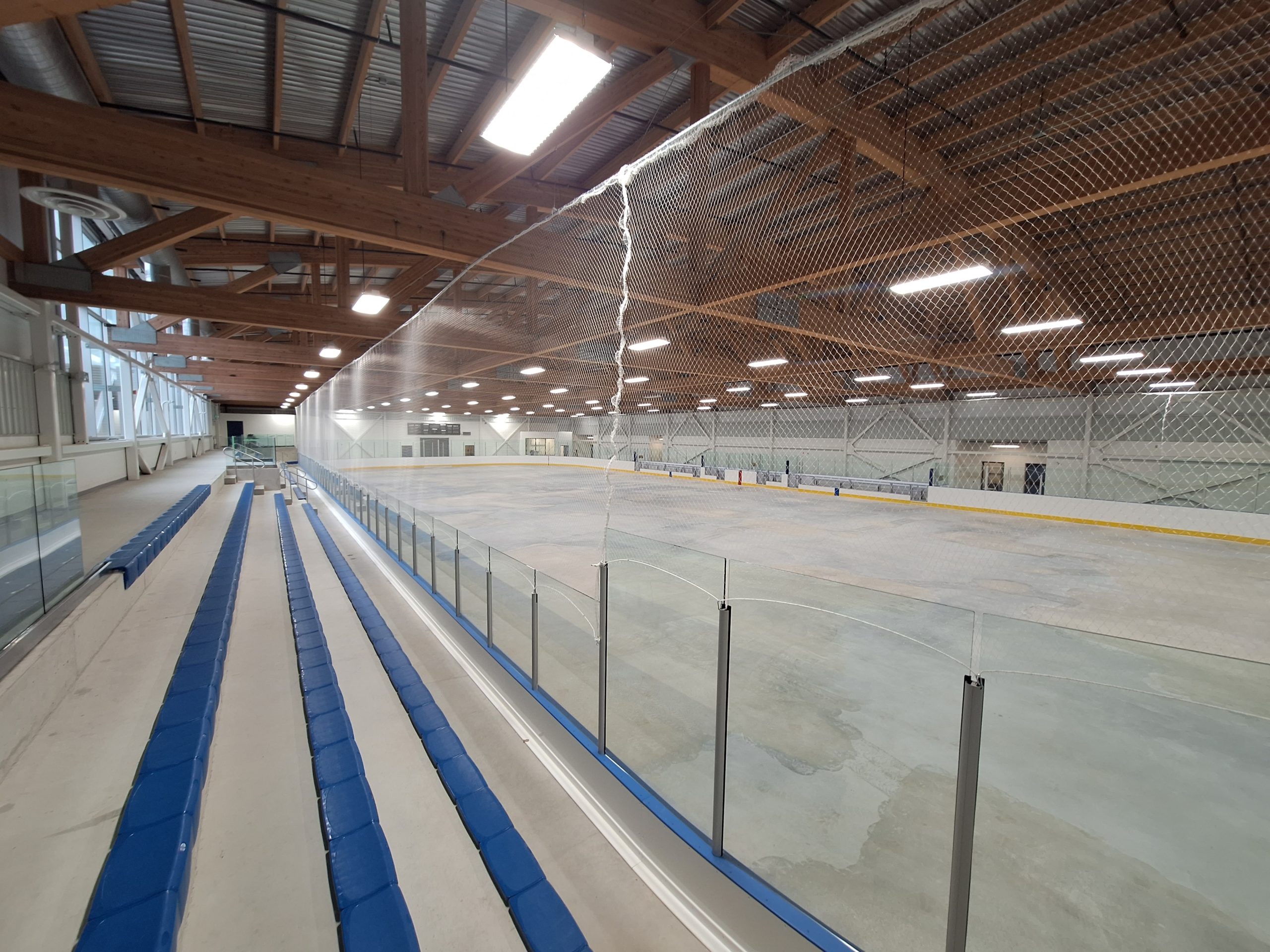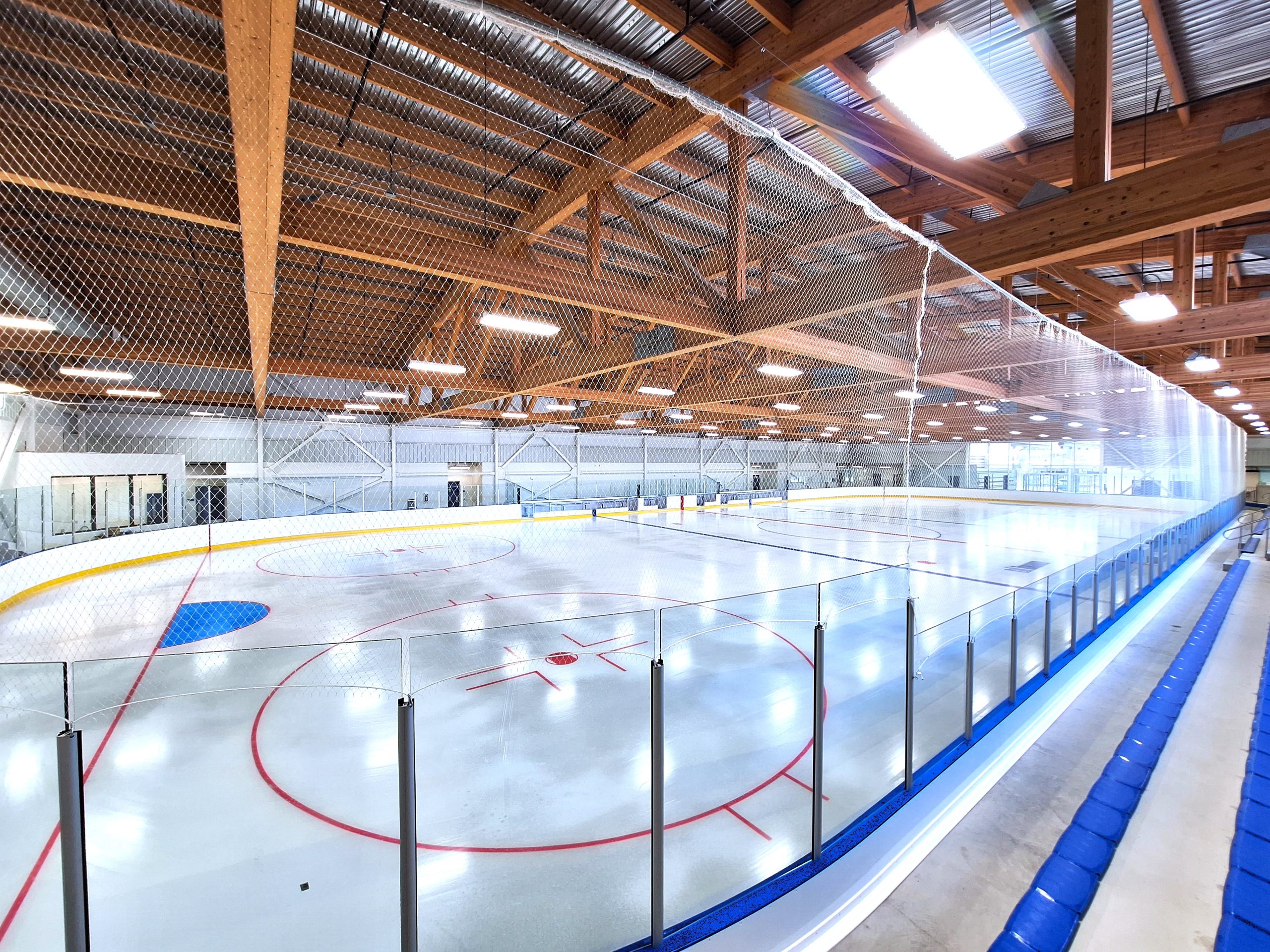 Inside the building, the rink dasher boards, rink netting and bleacher seating have been installed. Rubber flooring and benches in the change rooms are complete, and a lift connecting the ground floor to the mezzanine is in place. Installation of the acoustic ceiling, plumbing fixtures and refrigeration components is nearing completion. Current work includes installing rubber flooring around the rink, setting up communication and security wiring, and testing building systems.