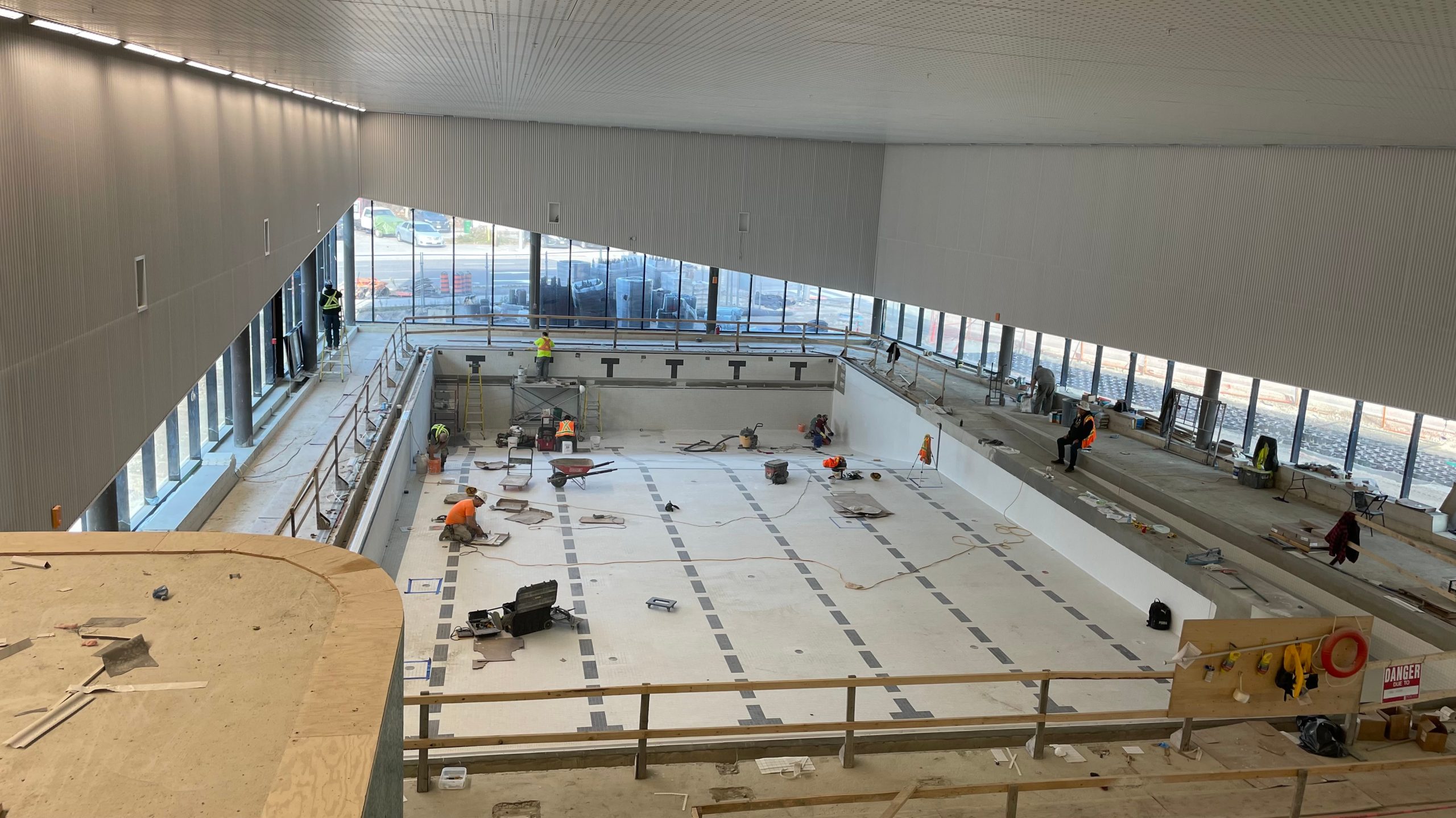 Windows for the community centre are nearing completion, and the installation of terracotta cladding panels is underway. Work on the pool area ceilings has started. Structural steel fireproofing is complete. Interior wall installations and tiling are progressing well. Mechanical and electrical installations continue at the community centre and the Fieldhouse, where windows and exterior finishes are in progress.