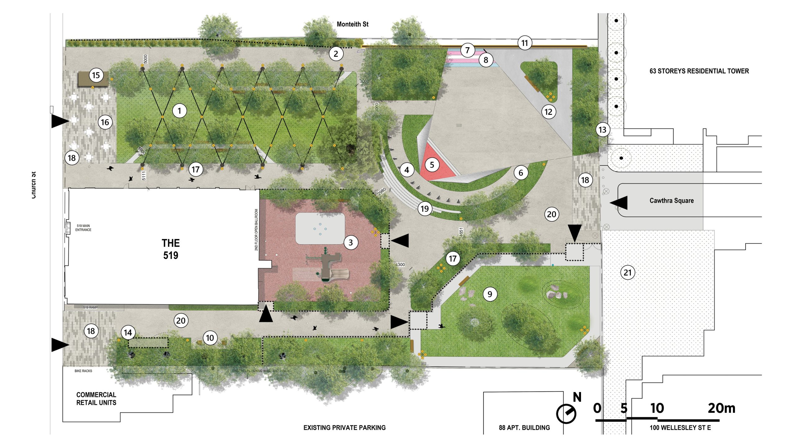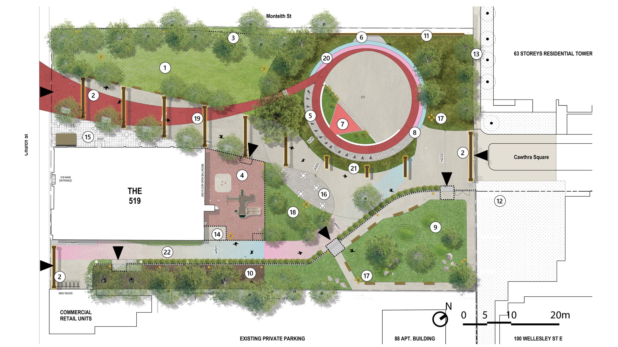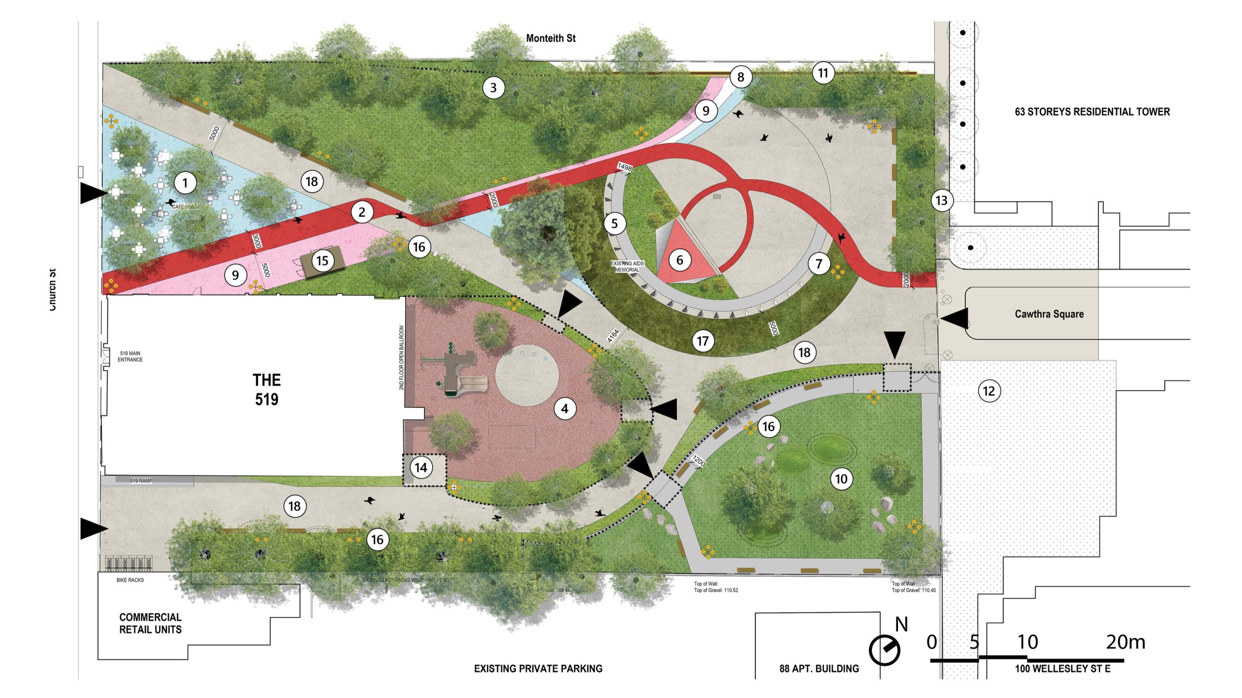 The design adds new lighting frames along the main path from Church Street, and new seating areas beside and washroom building, café and The 519. It also includes a large open lawn on the north side of the park for community use, events and 519 programming. The existing heritage brick wall frames the park’s north edge and is maintained.