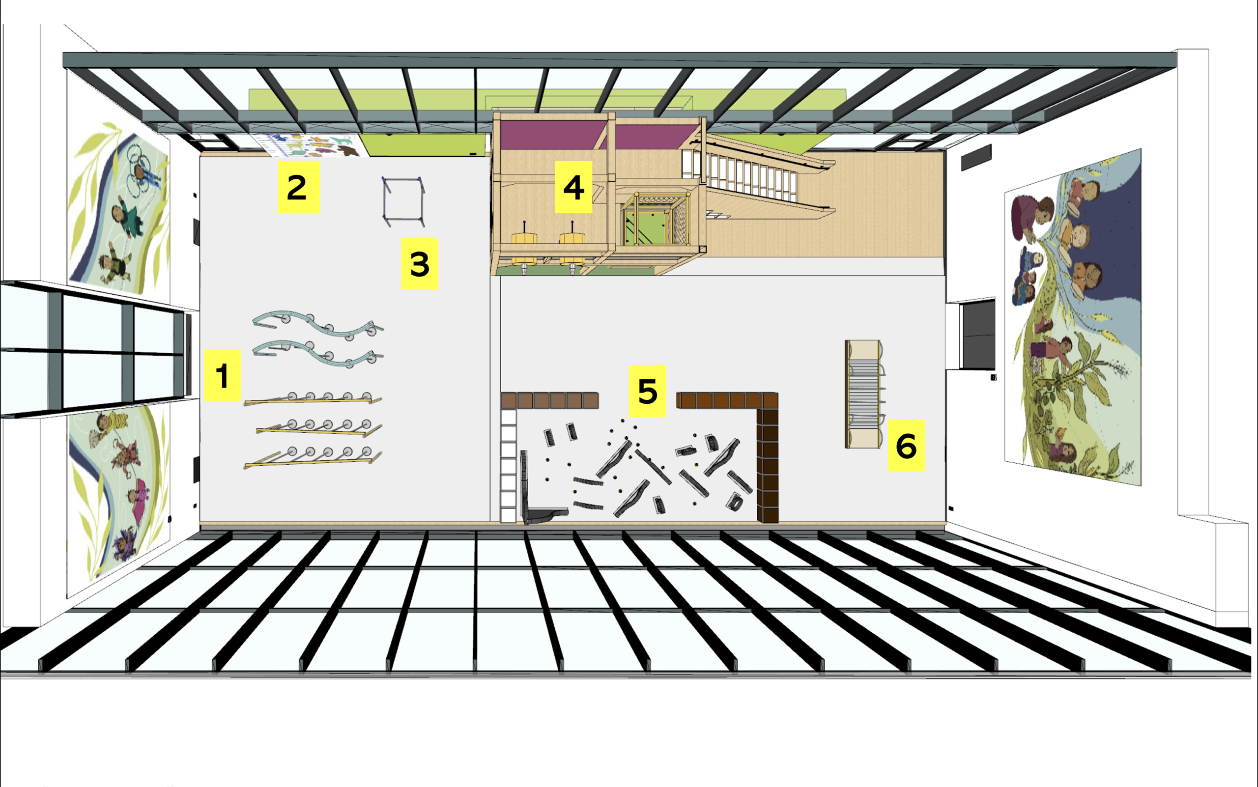 In this phase, the final design for the new indoor play space was posted on this page and shared with the project mailing list. The project will move into the detailed design phase, where the design team will work through the technical details and plans for the construction contractor.