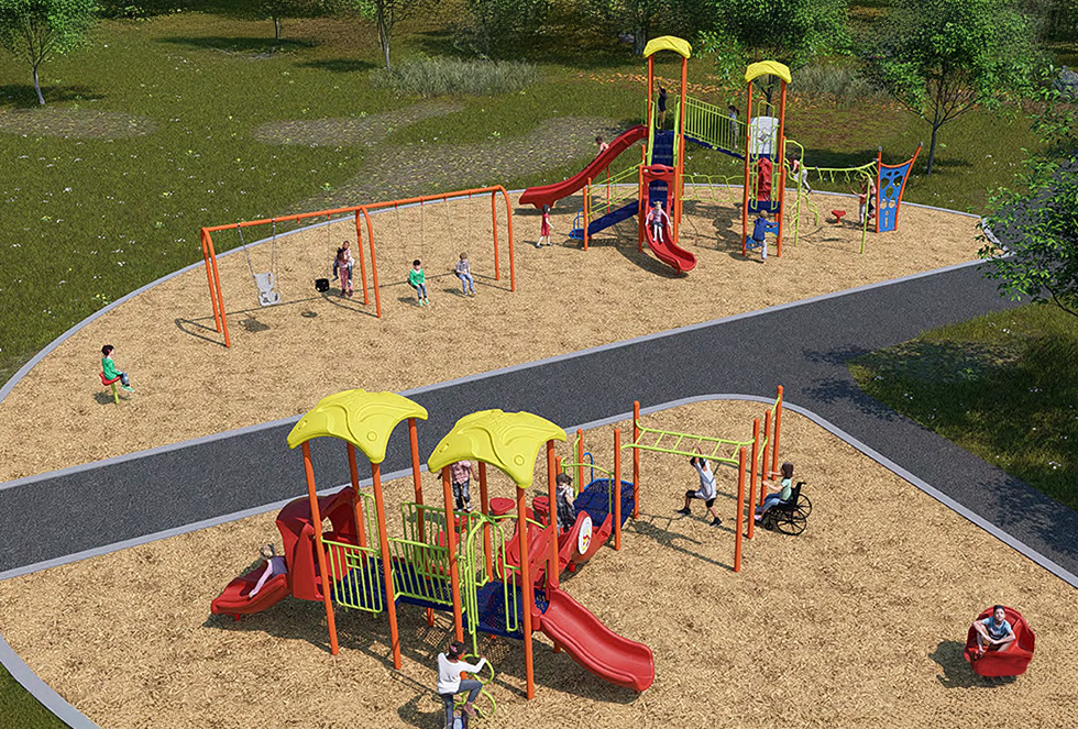 The play equipment and pathway connecting to the playground area will comply with AODA. Learn more about how playgrounds are made accessible.