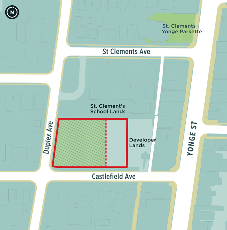 The new park is located at the northeast corner of Castlefield Avenue and Duplex Avenue, one block west of Yonge Street just south of St. Clement’s School. The park site is adjacent to a redevelopment project at 2940-2514 Yonge St., which will be temporarily using 934 m2 of the park site for construction staging.