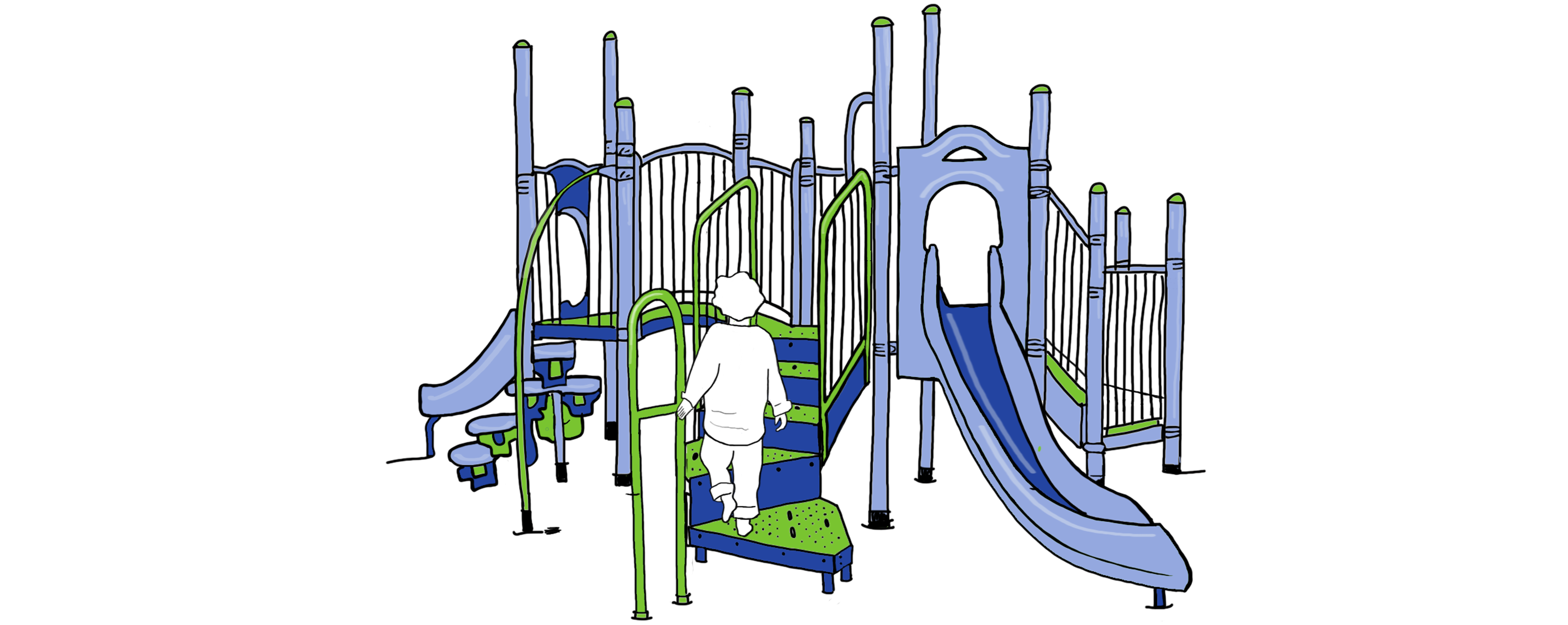 An accessible ramp allows those with mobility aids to travel from the playground surface to elevated playground equipment. Accessible ramps are best suited in large play spaces to accommodate an accessible slope for those using mobility assisting devices.