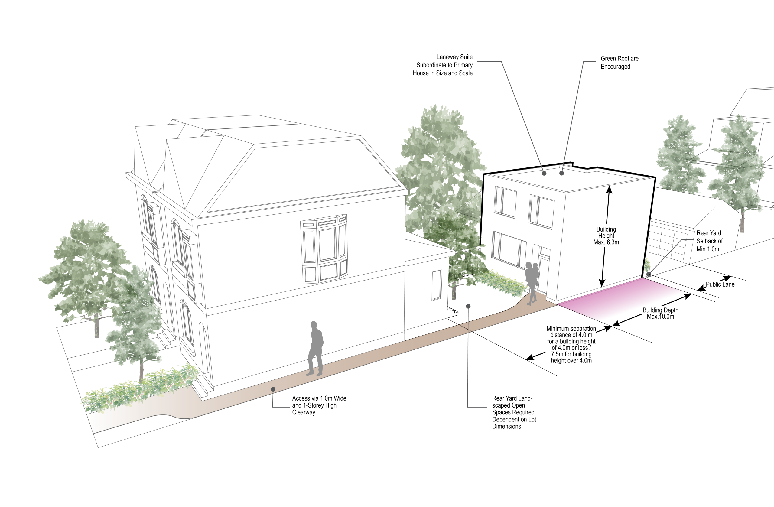 An illustration of a laneway suite fronting onto public laneway.