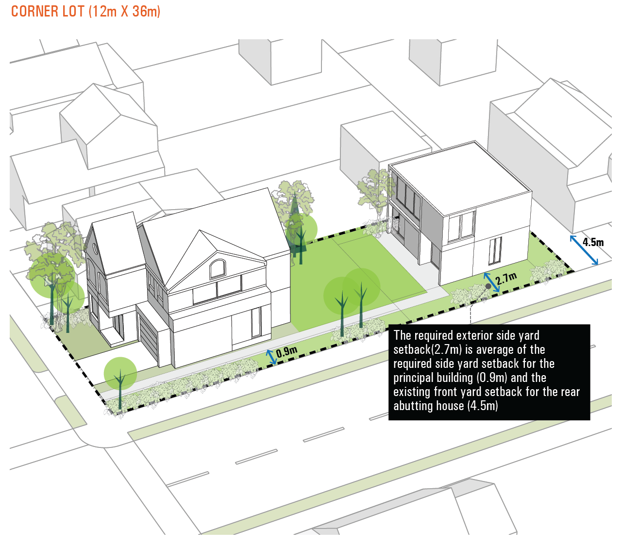 Rear Yard Demonstration Plan: A 50% soft landscaped open space is required for lots greater than 6 metres wide, and is intended to balance an increase in housing with maintaining rear yard character and stormwater retention, which is critical to mitigate climate change impacts.