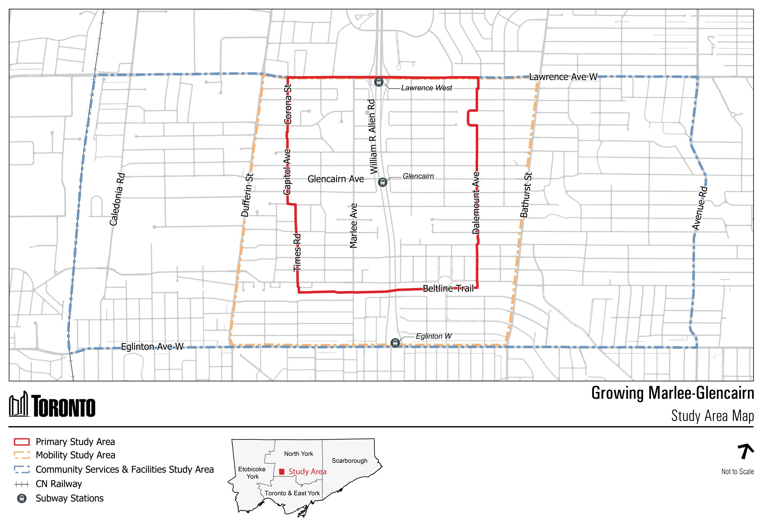 The primary study area for Growing Marlee-Glencairn is located generally within 800 metres of Glencairn Subway Station, south of Lawrence Avenue West, west of Bathurst Street, north of Eglinton Avenue West and east of Dufferin Street (see map below). Larger study areas are being used for mobility, parks and open space, community services and facilities, servicing and stormwater management.