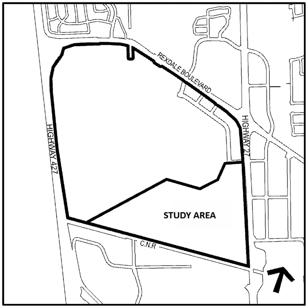 The Woodbine lands are located at 555 Rexdale Boulevard and are bounded by Rexdale Boulevard to the north, Highway 27 to the east, the rail corridor to the south, and Highway 427 to the west. The lands are currently occupied by the Woodbine racetrack and casino.
