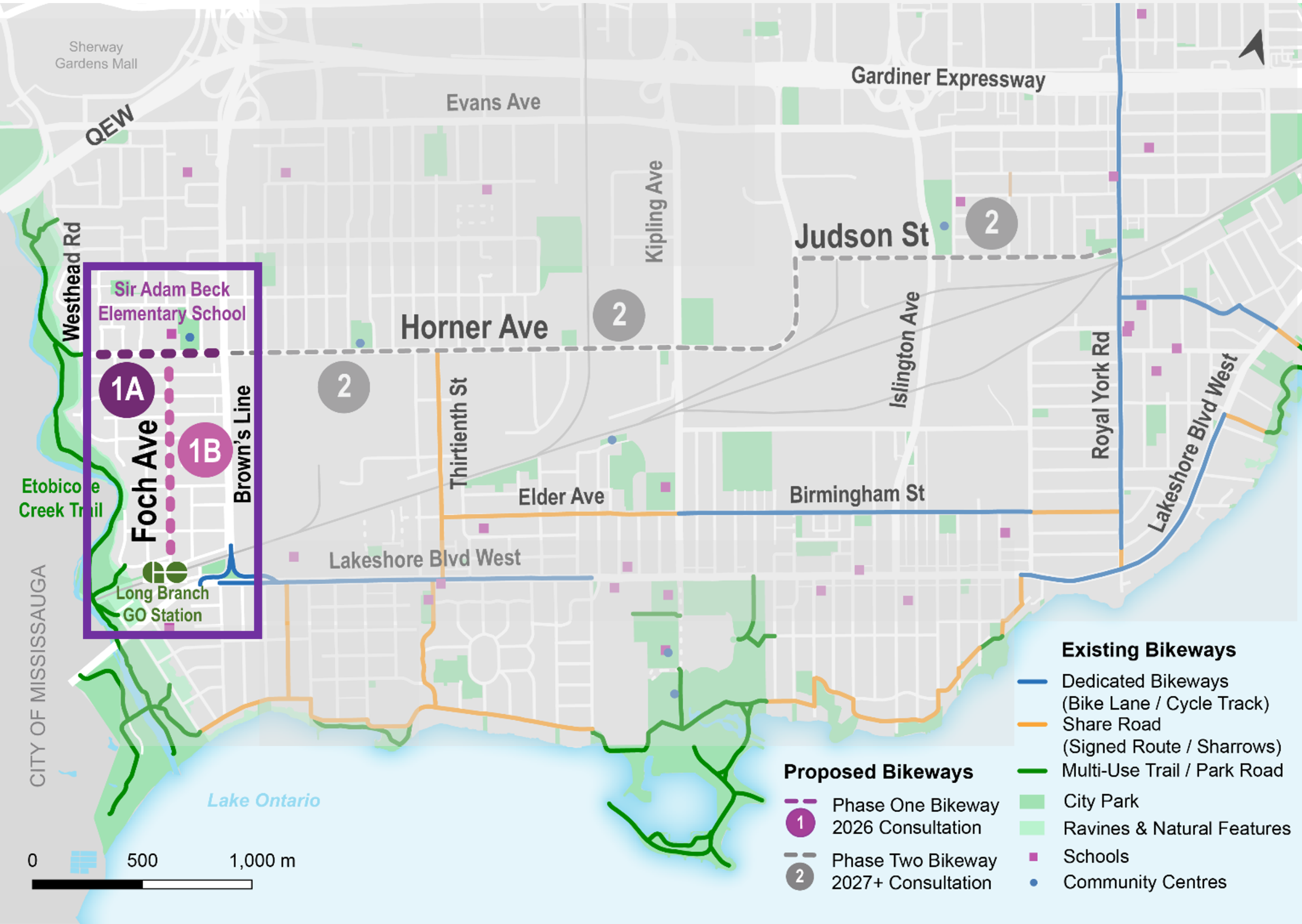 The proposed changes will be designed and consulted on in two phases. Phase 1 changes are proposed for Horner Avenue from Westhead Road to Brown’s Line, and Foch Avenue from Horner Avenue to Edgeware Drive. Improvements would maintain motor vehicle lanes while slowing the speed of cars through traffic calming and the addition of bike lanes and shared lane markings. The bikeways would connect the Etobicoke Creek Trail, Sir Adam Beck School, Alderwood Pool and Library, residences, church, and the Long Branch GO Station.