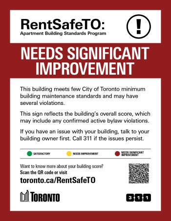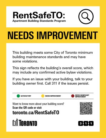 These colour-coded signs will help tenants and the public better understand the conditions at apartment buildings. Tenants and members of the public can contact 311 to report missing or inaccurate signs.