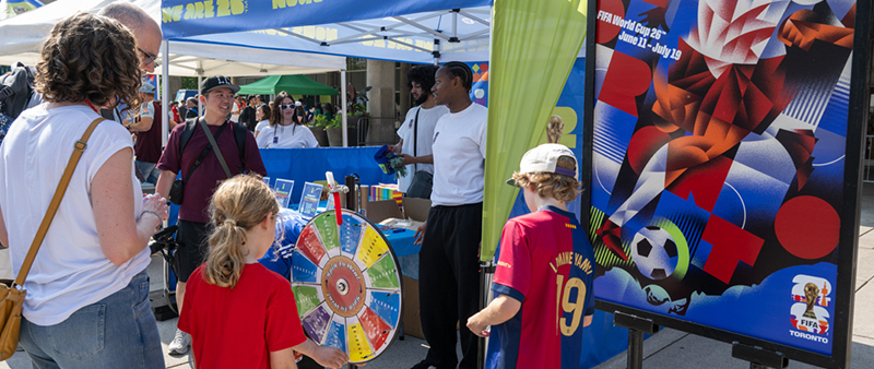 His design emphasizes the grandeur and energy of the FIFA World Cup™ with a larger-than-life player in motion, proudly wearing a red maple leaf. The grid background represents the lines on a soccer pitch, as well as Toronto’s streets and the idea of a quilt to reflect the collection of wonderful and vibrant people and neighbourhoods that come together to make us “the world in a city.”