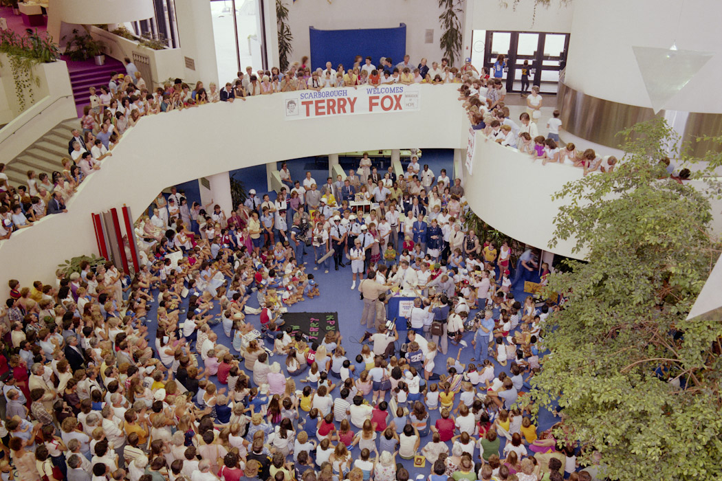 Initially, Scarborough staff were concerned there wouldn’t be a crowd to greet Terry, but they couldn’t have been more wrong. The crowd filled the central space and jammed the surrounding balconies of the Civic Centre with an outpouring of community support.