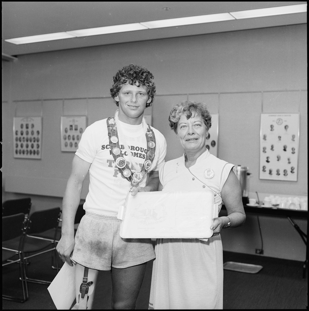 Terry was appointed Honorary Mayor of Scarborough for the day, and the City of Scarborough pledged a $5,000 contribution. In addition, Helen Campbell, widow of Scarborough’s first Mayor, Albert Campbell, presented Terry with a cheque from the Scarborough Unit of the Canadian Cancer Society. Terry was also presented with a commemorative tray by Alderman Shirley Eidt.