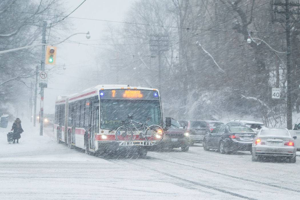 An articulated bus negotiates Bathurst Street traffic on a snowy day January 28, 2019 Photographer: Derek Stryland. Courtesy of the TTC.
