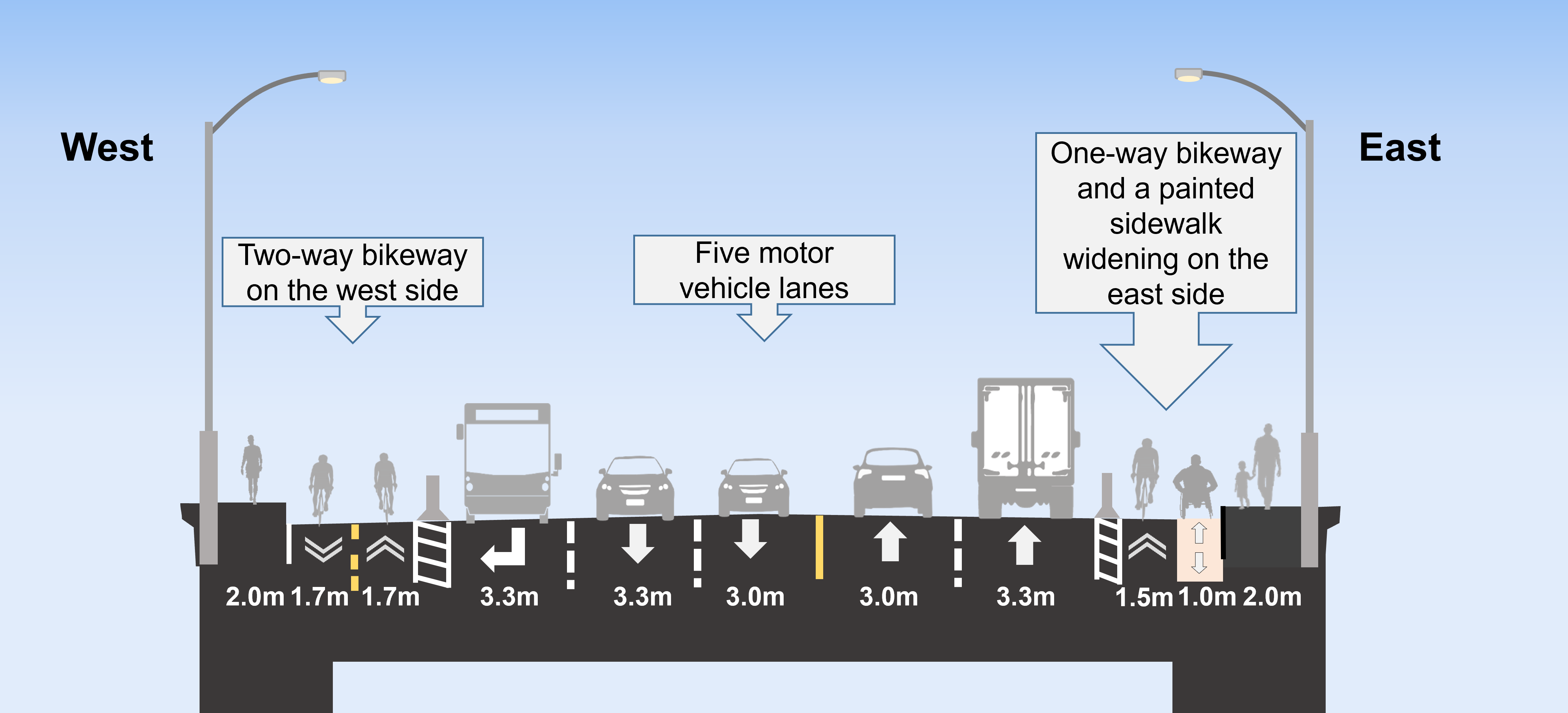 The unprotected bicycle lanes were converted to a one-way cycle track on the east side and a two-way cycle track on the west side. This arrangement is to reduce the number of required signalized crossings and, thus, reduce delay and encourage cycling.