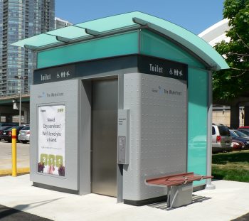 Toronto’s automated public toilets were first introduced in 2008. The automated public toilet is activated by inserting a $0.25 coin or token. Each patron has up to 20 minutes per use, with the time clearly communicated through a three-step audible warning process and a visual blinking light. After each patron exits, the unit will seal itself and begin a self-cleaning cycle. The unit is equipped with several sensors, and the cleaning procedure will not start if a patron is detected.