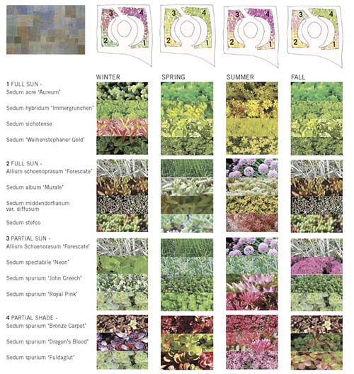 The garden is a mix of sun and shade tolerant sedums and perennials grown in a modular pre-vegetated tray system. The species range from grasses such as Feather Reed Grass and Little Bluestem to flowering Coneflower and Asters. All planting is united by a sedum mix ranging in colour from blue to green to burgundy. The trays are arranged in linear fields of purple, pink, yellow/orange and green, which correspond to the varying site conditions of full sun to shade and will change colour seasonally in this dynamic landscape.