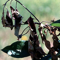 Sudden browning and death of young shoots and new, unfolded leaves in spring.